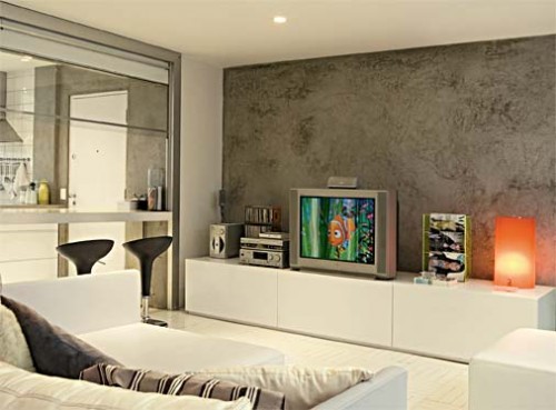 Traga o quadro-negro para dentro de casa!, Minha casa Gosto muito de Cordilheira dos Andes (F 108) Suvinil! Bjs Sei que ha tintas que imitam o tom do concreto, mas nao sei se fica um post sobre cimento queimado, vou ver se me concentro para finaliza-lo o quanto antes O despojamento e dado com a tinta que imita cimento queimado (Suvinil) aplicada na lareira. O mobiliario mistura pecas assinadas como a poltrona de couro